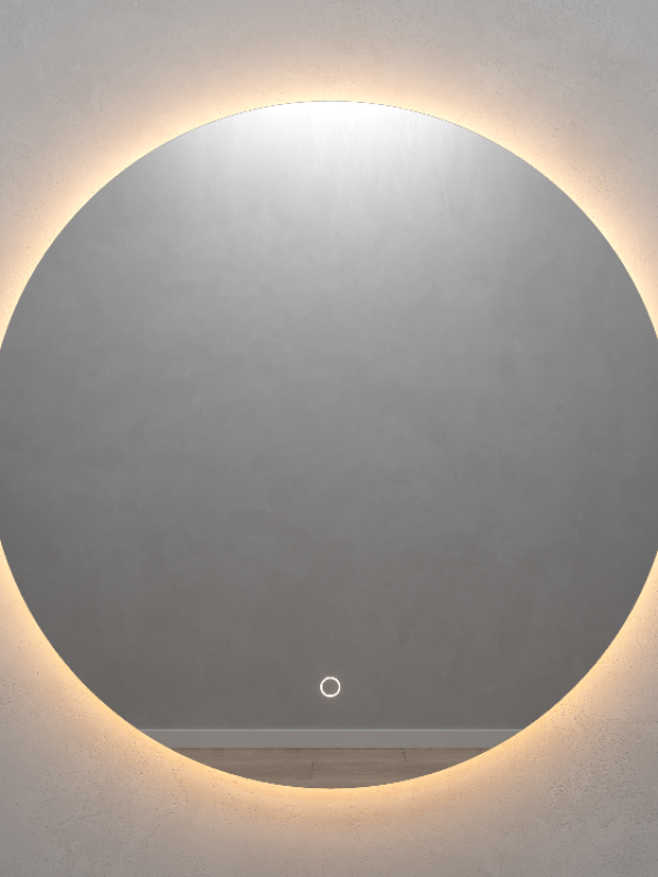 Безрамное зеркало круглой формы с контурной (тыльной) тёплой подсветкой, свет 3000К. Подложка из высококачественного МДФ, светодиодная лента защищена матовым свето-рассеивателем от попадания пыли и влаги. Есть вывод 220W для подключения к сети, включение подсветки от сенсорной кнопки на зеркале.