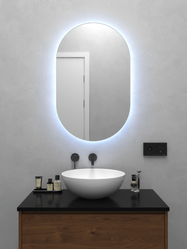 Безрамное зеркало овальной (капсульной) формы с контурной (тыльной) холодной подсветкой, свет 6000К. Подложка из высококачественного МДФ, светодиодная лента защищена матовым свето-рассеивателем от попадания пыли и влаги. Есть вывод 220W для подключения к сети, включение подсветки от выключателя на стене, либо от розетки.